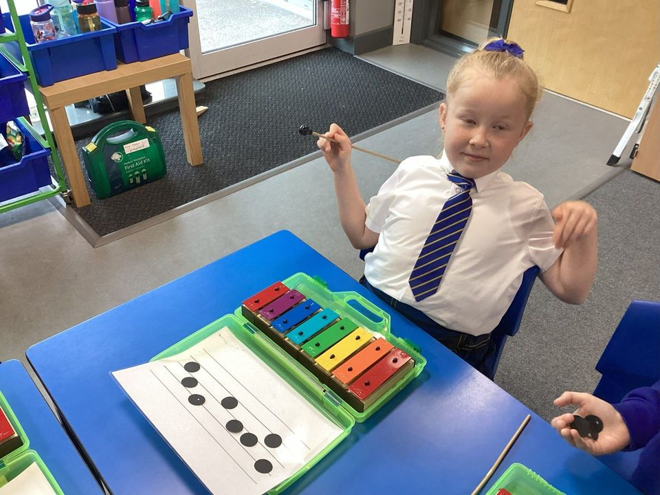 These children in year two have been learning how to read and write music notation. They then use moveable black dots to create their own music which they practice and then perform to the rest of the class.